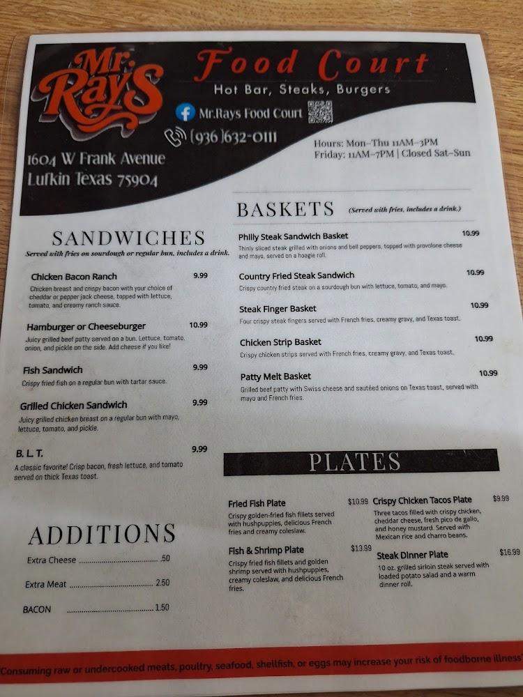 Welcome to Mr. Rays Food Court, your go-to destination for delicious, locally-inspired cuisine in Lufkin, TX. Enjoy a relaxed atmosphere perfect for lunch or dinner, whether dining in or taking out. Our menu features a delightful array of traditional dishes, small plates for sharing, and irresistible desserts, all at an affordable price range of $10-20. We pride ourselves on accessibility, providing wheelchair-friendly seating and restrooms. Ideal for groups and solo diners alike, Mr. Rays also offers catering and accepts reservations for your convenience. Visit us today for a memorable dining experience!